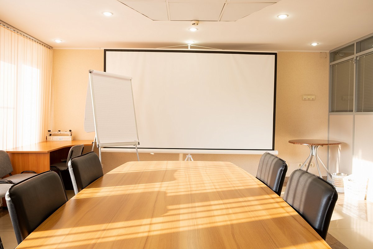 В переговорной комнате стоит круглый стол и стулья. Комната оборудована проектором и экранном